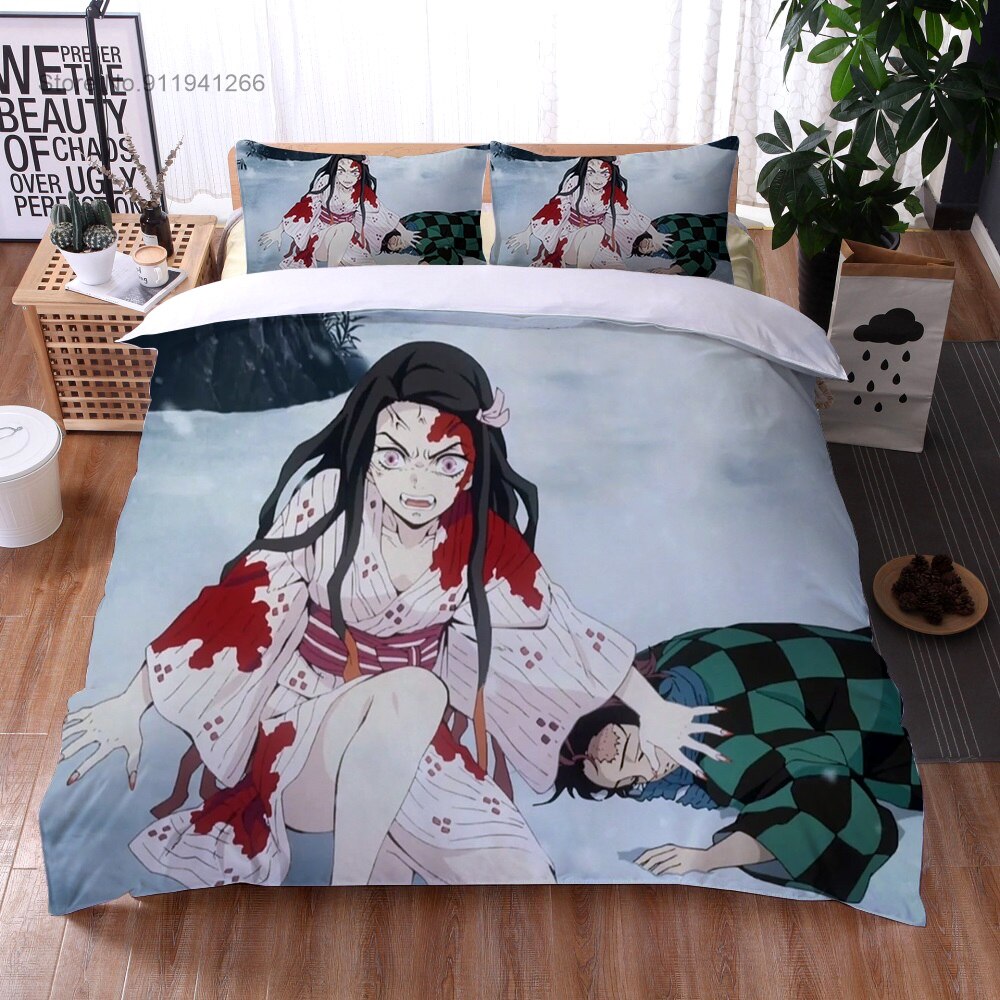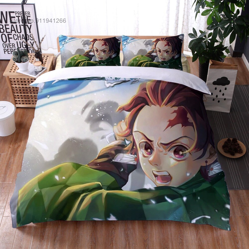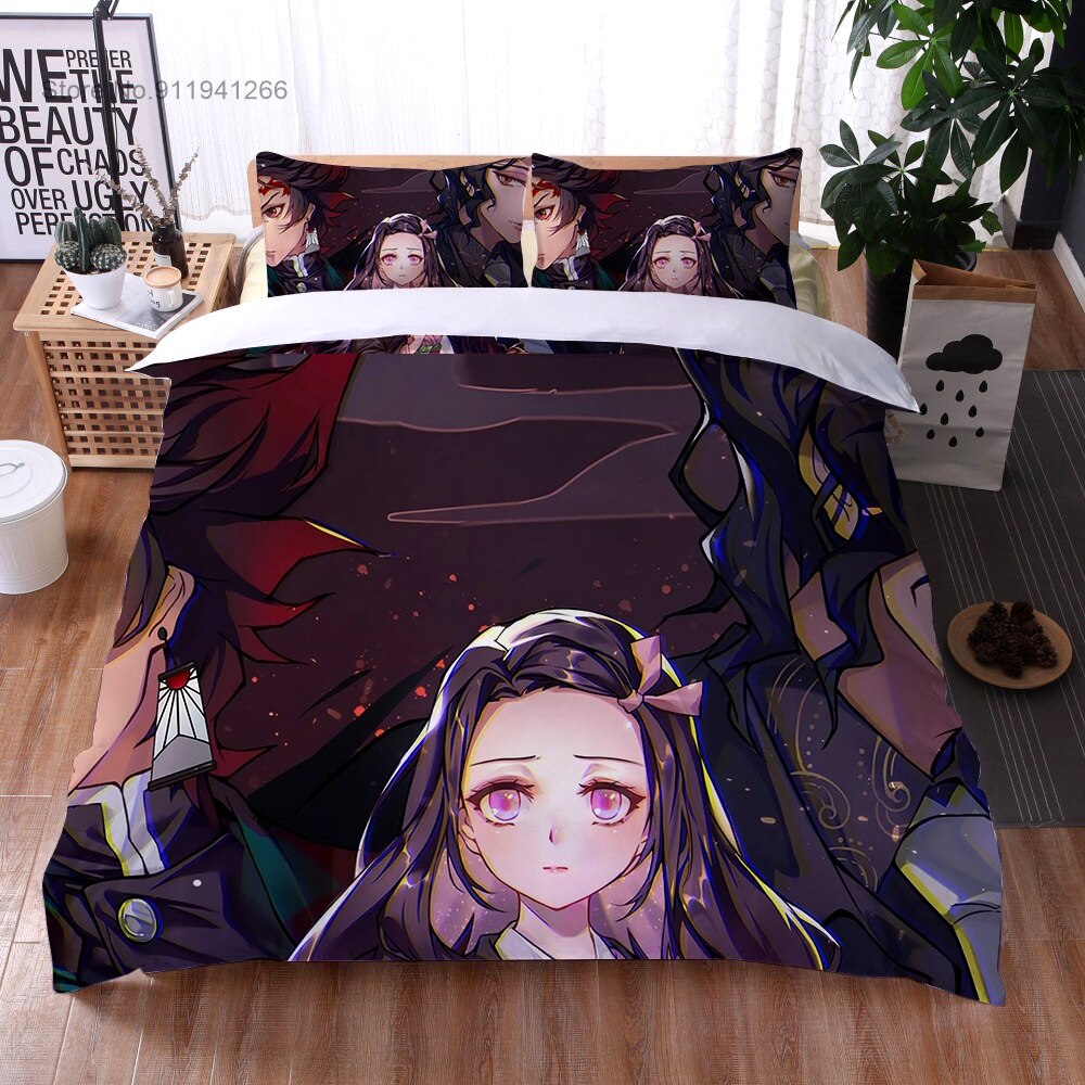 Anime Demon Slayer Bedding Set Cartoon Duvet Cover Set 3D Print Demon Blade Cover Pillowcase Keep Warm Kids Gift