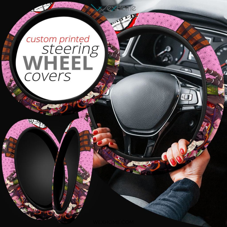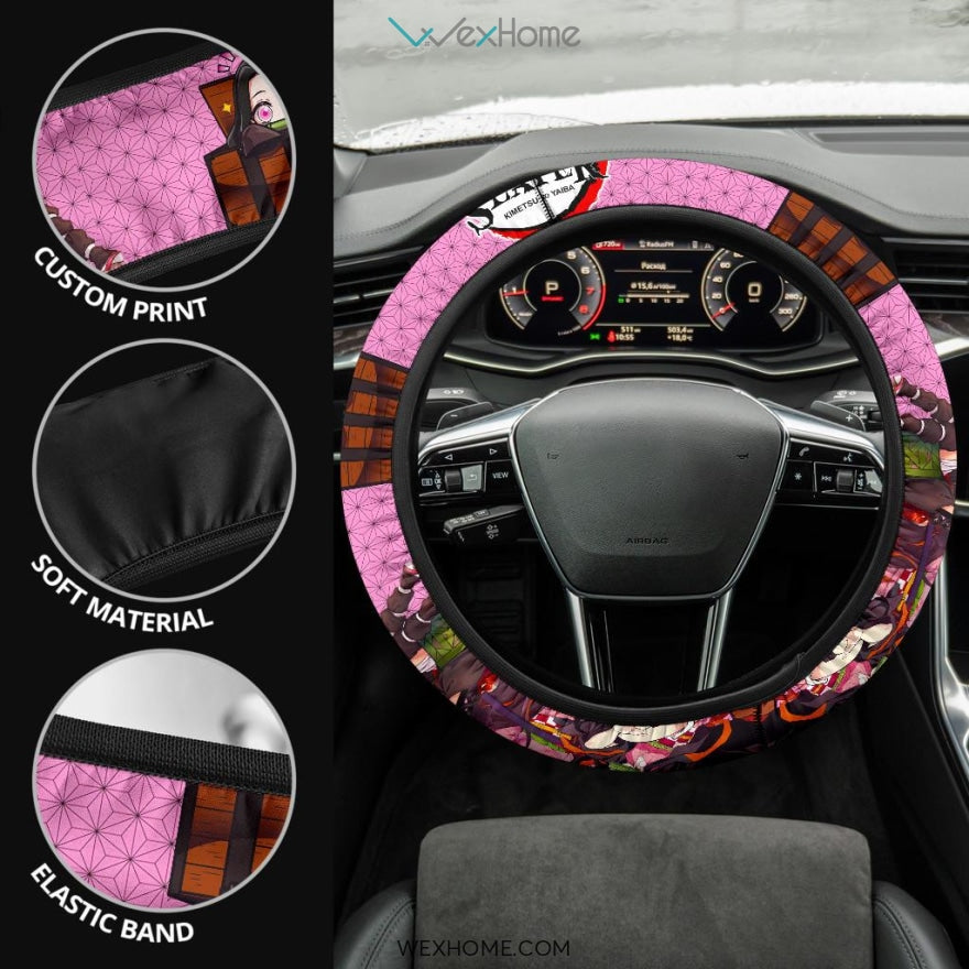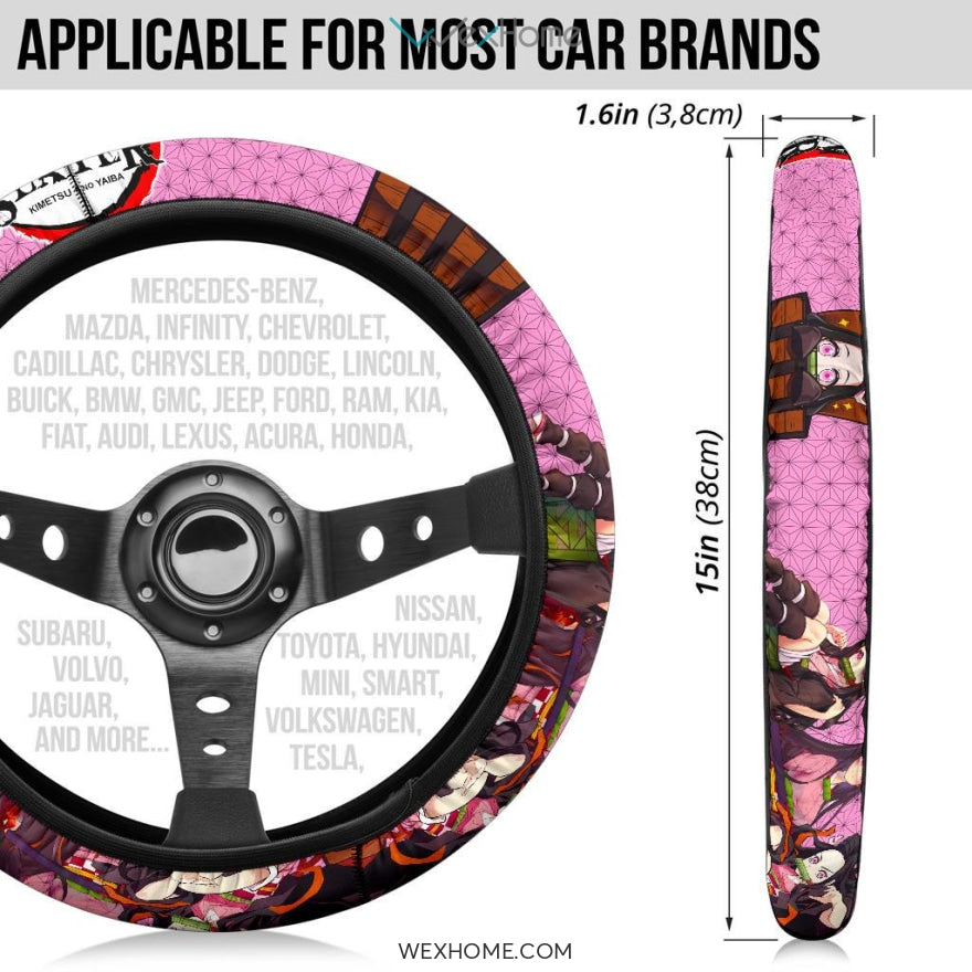 Demon Slayer Anime Steering Wheel Cover | Nezuko Pretty Girl Moments Pink Background Steering Wheel Cover