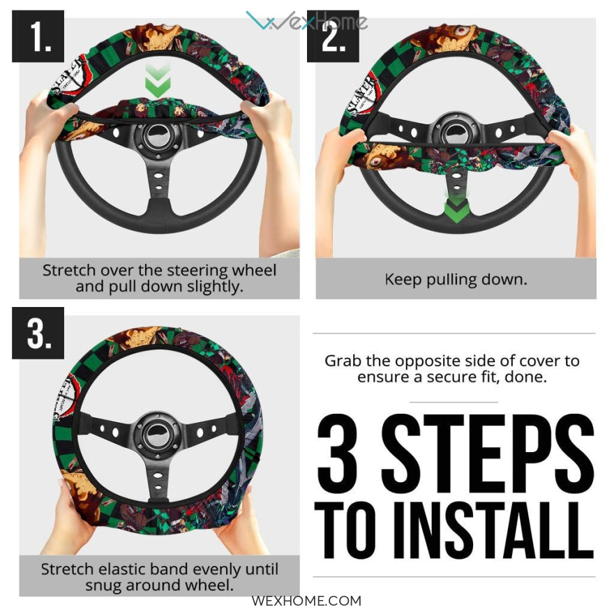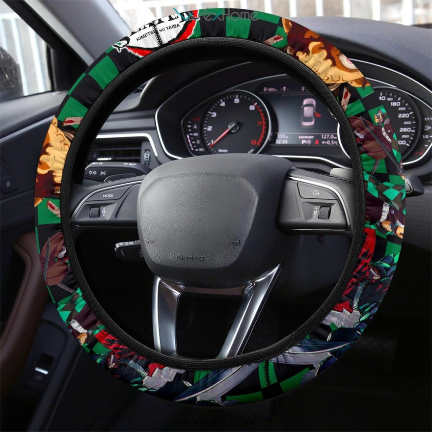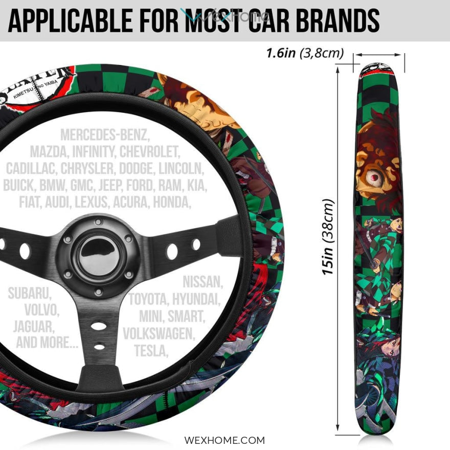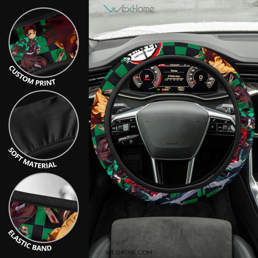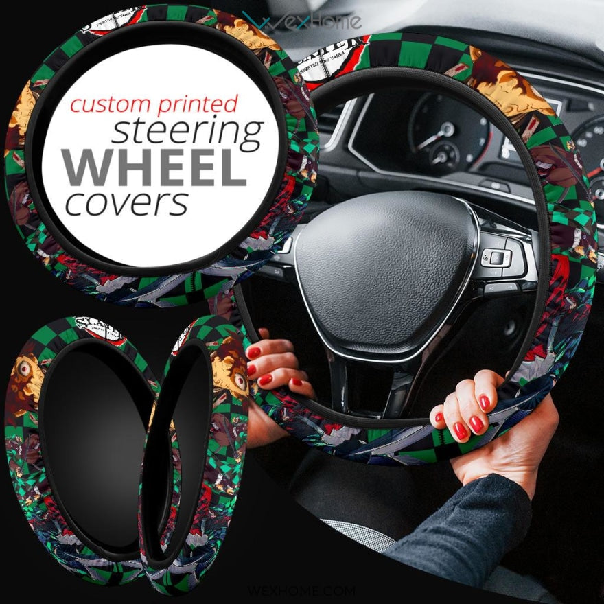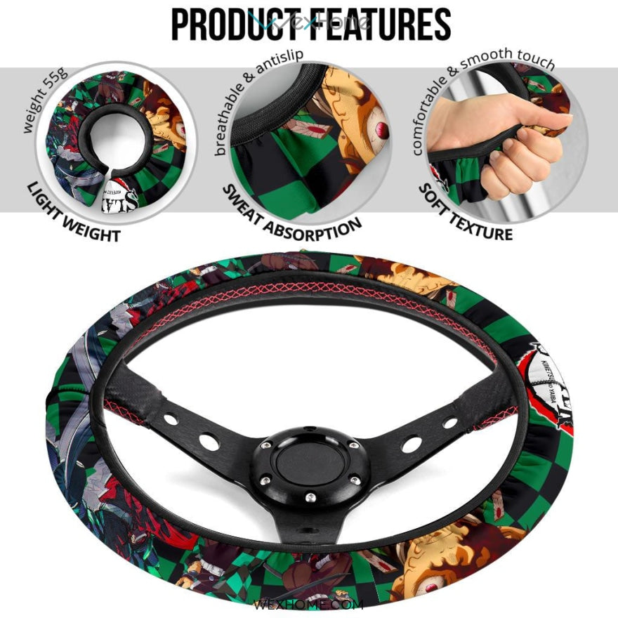 Style: Steering Wheel Cover - Demon Slayer Anime Steering Wheel Cover | Tanjiro Power Black Green Checker Background Steering Wheel Cover NA071405