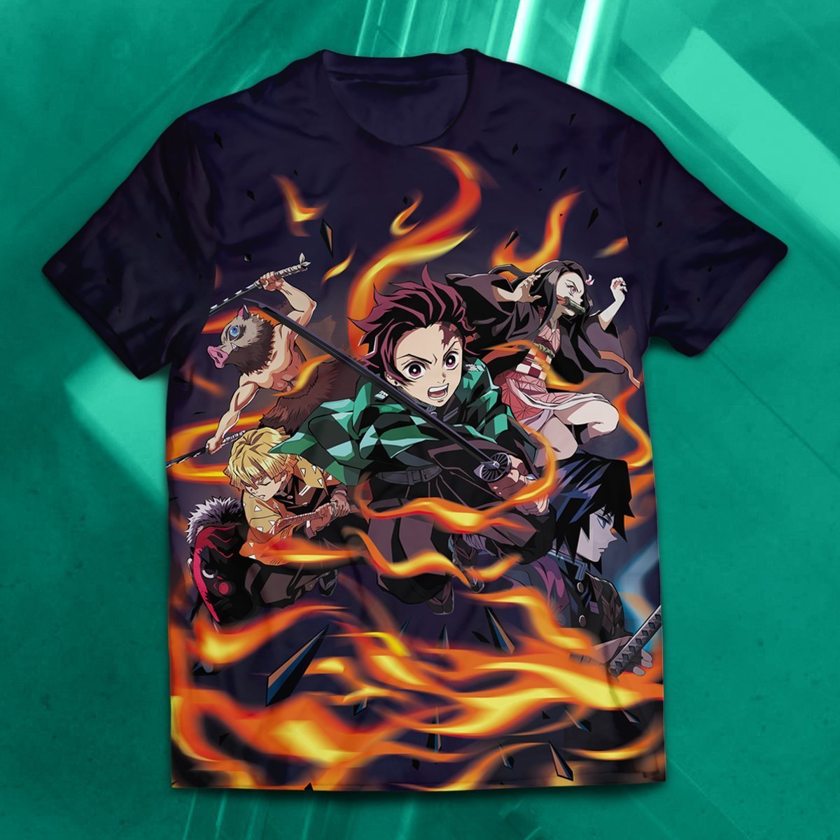 Demon Slayer Shirt Tanjiro Nezuko Giyu Tomioka Zenitsu Inosuke Fire Black T-Shirt Adult Full Print